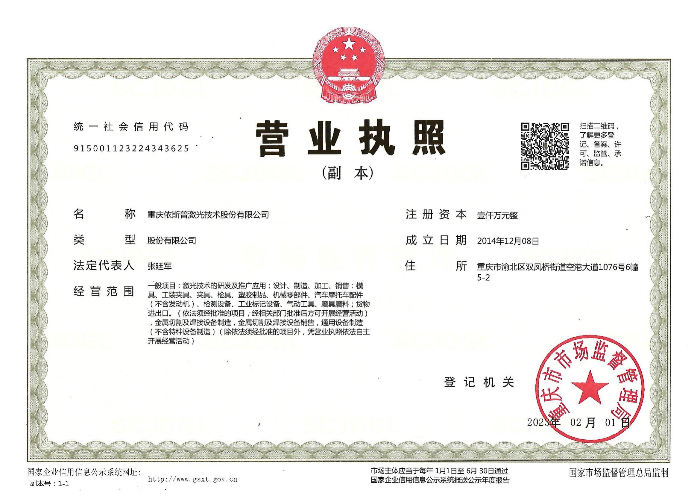 重慶依斯普激光技術(shù)股份有限公司 是一家科技型高新技術(shù)企業(yè),公司位于重慶市渝北區(qū)空港大道1076號置尚金冠工業(yè)中心,占地面積約五千平方米,吸收了國外的先進的技術(shù),專業(yè)研發(fā)、制造和銷售各類激光控制技術(shù)應用類產(chǎn)品。公司被評為創(chuàng)新基金重點培育企業(yè),專精特新企業(yè),通過了ISO9001質(zhì)量管理體系認證,產(chǎn)品多次獲得重慶市高新技術(shù)產(chǎn)品證書及實用新型專利證書等。 依斯普激光的主導產(chǎn)品為激光切割機系列、激光焊接機系列,激光打標機及氣動打標機系列等,廣泛應用在